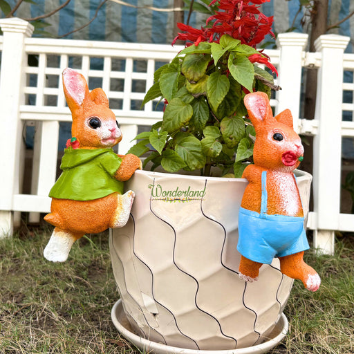 Wonderland Whimsical Climbing Bunny Garden Pot Hangers - Set of 2 Hand-Painted Resin Rabbit Ornaments for Planters and Flower Pots