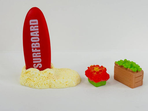 Wonderland set of 3- Miniature Beach Vacation Set - Surfboard, Planter Box, and Coral/Plant Accessory for Dollhouse, Terrarium, or Crafting