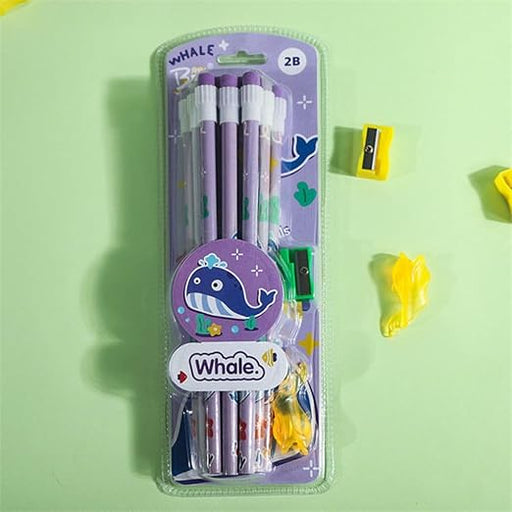 Wonderland 2B Pencil set -Pack of 12 with top erasers , 1 grip and 1 sharpner | Writing pencils for school and return gifts|Whale Design