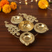 This charming decorative stand features a central hammered-texture bowl surrounded by three traditional oil lamps (diyas) and three intricately designed peacock motifs. The entire piece boasts a gleaming golden finish, creating an elegant and festive aesthetic. Perfect for religious ceremonies, festive decorations, or simply as a beautiful centerpiece, it combines functionality with delicate artistry. The peacock add a touch of whimsy and nature to the traditional diya setup.